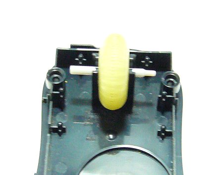 | ホイールを取り付けると、左のようにほぼピッタ リ、というかホイール全体を包むゴムと台座で 適度なホイールの回転抵抗を作っています。 なので少しでも異物が入ると、途端にホイー ルが重くなります。 |
