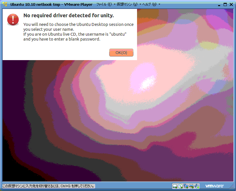 | VMWareの画面ですが、物理マシンを使用 しても、最初はこの画面が出ます。 「Unity用ドライバがねぇぞ。とりあえず一度 デスクトップ版で入っとけや(意訳)」 そもそもUnityってのが何かわかりません。 |