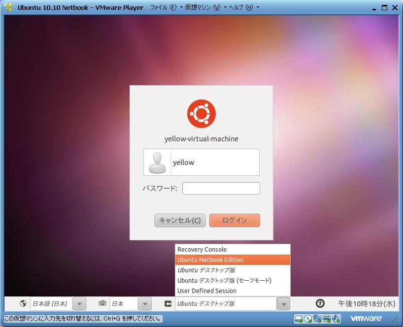 | ログオンユーザを選択後、画面下から 「Ubuntu Netbook Edition」を選択して下さい。 選択した状態でパスワードを入力しログオン すれば、Unityでログオンできます。 |