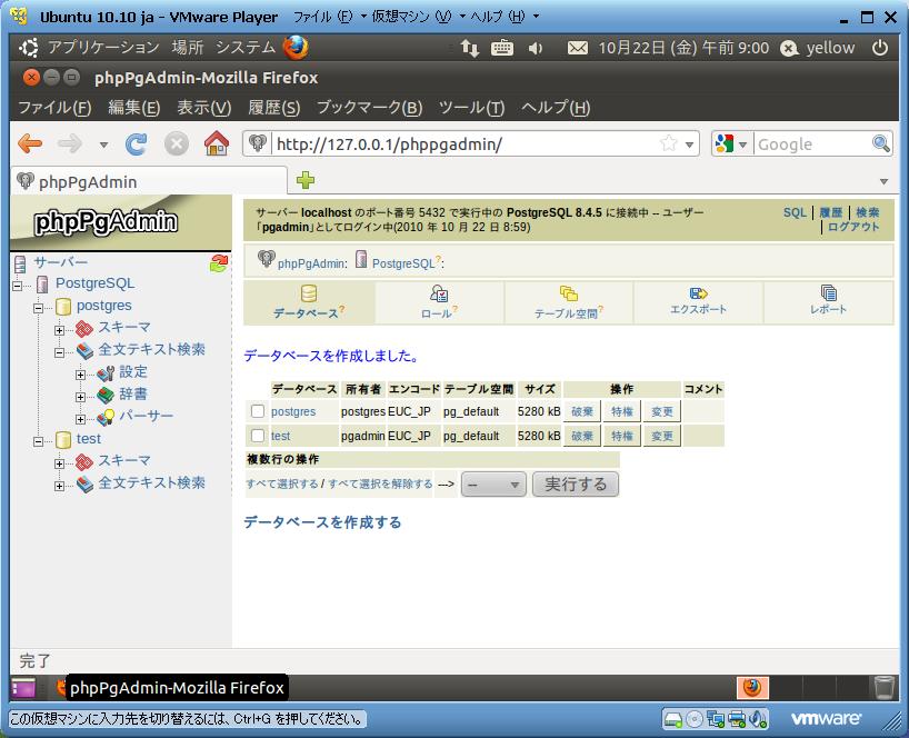 | 環境構築に関しては、http://kakkun.asukablog.net/Entry/83/とほぼ 同様です。差分は、postgresqlの起動が/et//init.d/postgresqlになっ ています。 但しphppgadminに関して、現状正常に動きません。詳細は Ubuntu 10.10 phppgadminが正しく動かない件(10/14現在)を ご参照いただければと思います。 解析が始まっている模様ですが、データベースのエンコーディング や何らかのサービスのロケールに関係する可能性があるようです。 (※追記2を参照) |