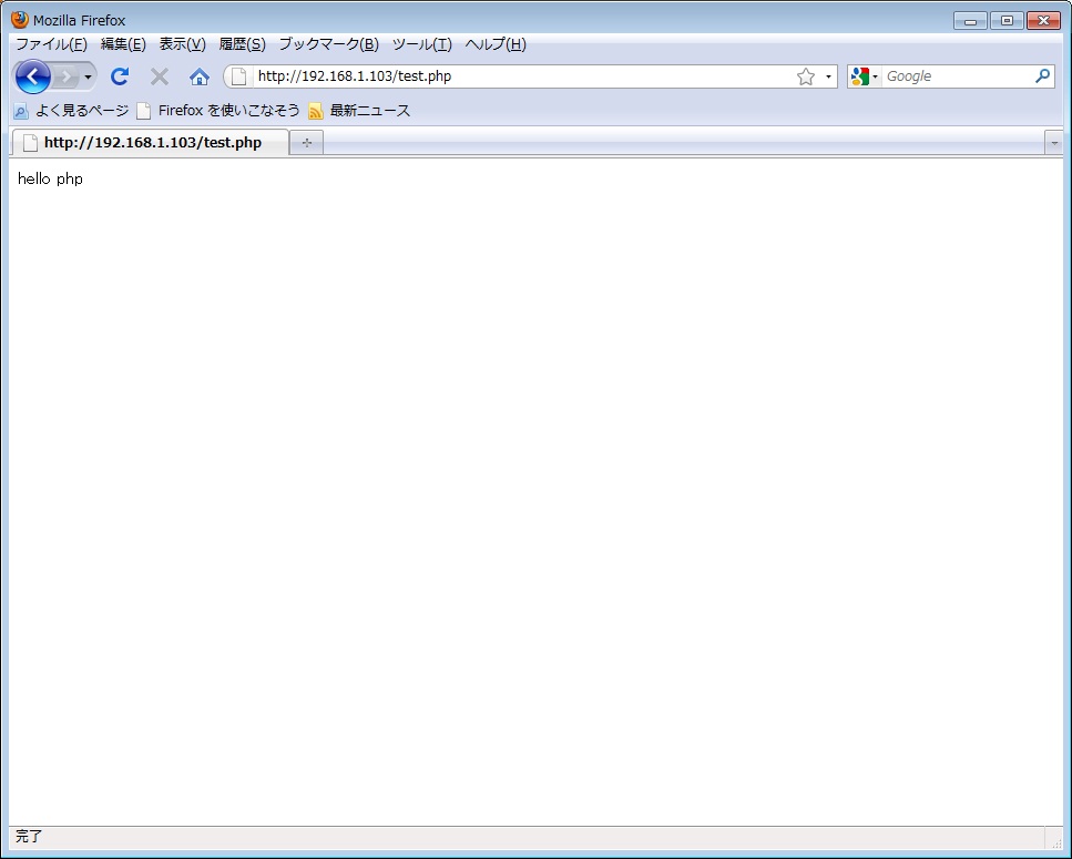 ブラウザを起動し、アドレスを入力して ください。IPアドレスが192.168.1.103の 場合は、 http://192.168.1.103/test.php になります。 左のような画面が表示されればOKです。 |
