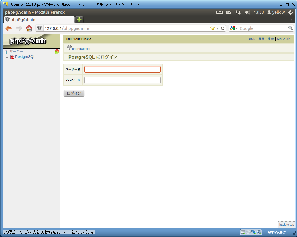 | 左袖の「PostgreSQL」をクリックすると、 ユーザ名とパスワードの入力を求められます。 (6)で登録したものを入力します。 |