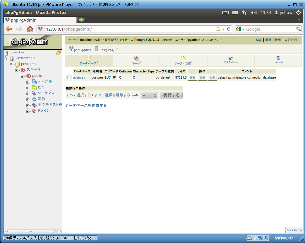 デフォルトだと「--no-locale」オプションがないため、2バイト文字が扱えません。 本書ではデフォルトをEUC-JPにしているので、その他のコードでDBを生成する 場合はいままでと手順が変わります。こちらをご参照ください。 |