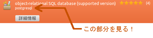 root@yellow-virtual-machine:/var/lib/postgresql/9.1# su - postgres → 権限をpostgresに変更 postgres@yellow-virtual-machine:~$ createuser -P xxxxxx → xxxxxxというユーザを作成(適宜変更してください) Enter password for new role: Enter it again: → パスワードの入力&再入力(適宜入力してください) Shall the new role be a superuser? (y/n) y → スーパーユーザー権限の付与(適宜入力してください) postgres@yellow-virtual-machine:~$ exit ログアウト →postgres権限の終了 |