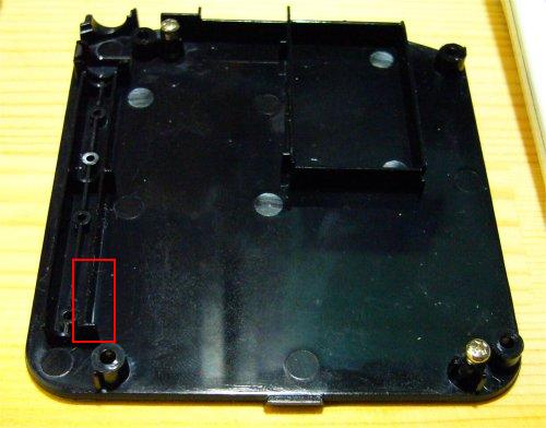 | 下面のプラパーツです。 左下の赤枠部分をニッパーなどで取ります。 そのままだと線の折り返しがキツくなることの対策 です。 |
