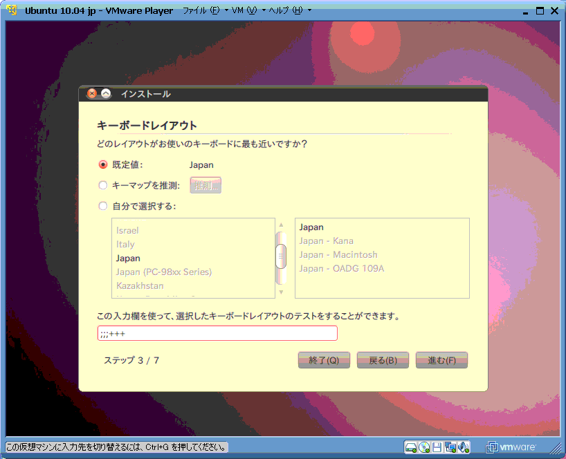 VMWarePlayerは3.0.1の簡易インストールでは、日本語キーボード