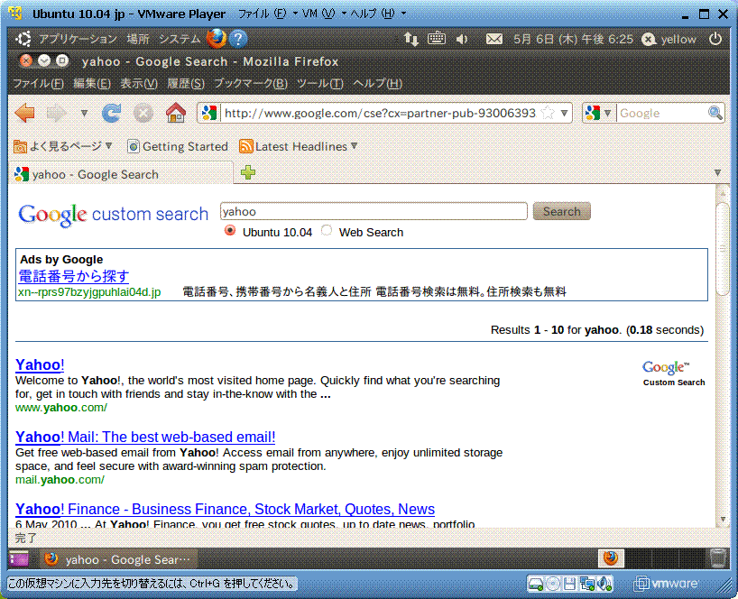| ここで紹介したすべてのエディションにおいて、ubuntu ホームページが表示されます。 そこから検索するとGoogleの英語検索結果が出ます。 まずホームを日本語ポータルに切り替える必要があり ます。 |