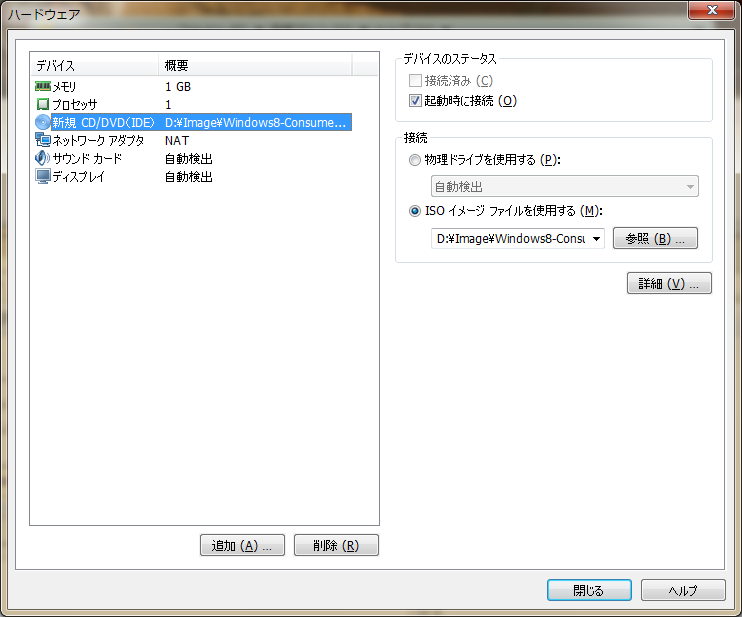 CDにダウンロード済みのISOを 設定。 この後、仮想環境を起動します。 |