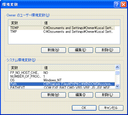 | (11) Windows上からシステムのプロパティを選択します。 詳細設定タブから環境変数ボタンをクリックし、左の画面 を出します。 下のペインからPathをダブルクリックし、 C:\Program Files\PostgreSQL\8.3\bin を追加します。 なおパス同士はセミコロンで区切ってください。 |