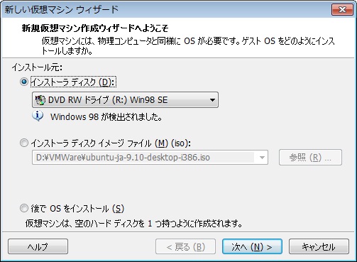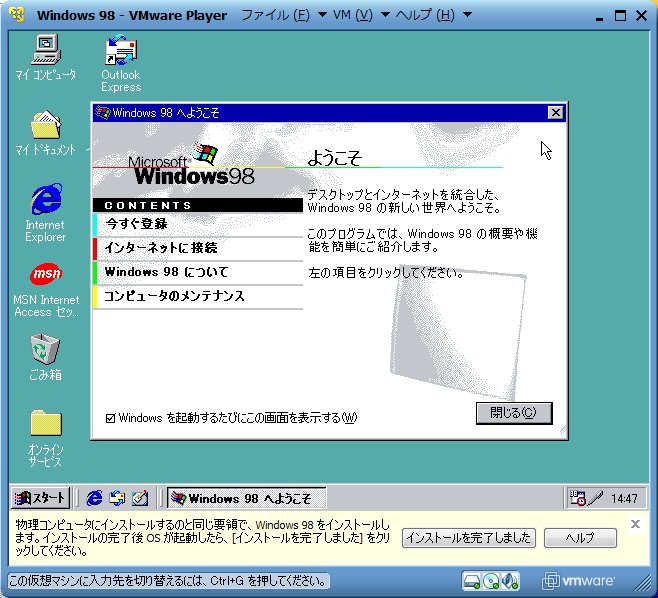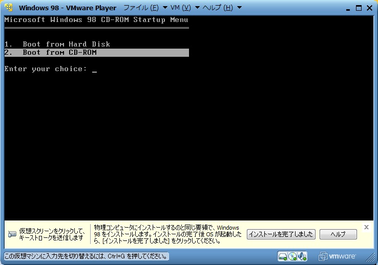 | 98のインストールを1から懇切丁寧に図示する つもりはないので、とりあえず初期画面だけ。 このあとToolsも導入し、正常に起動しました。 |