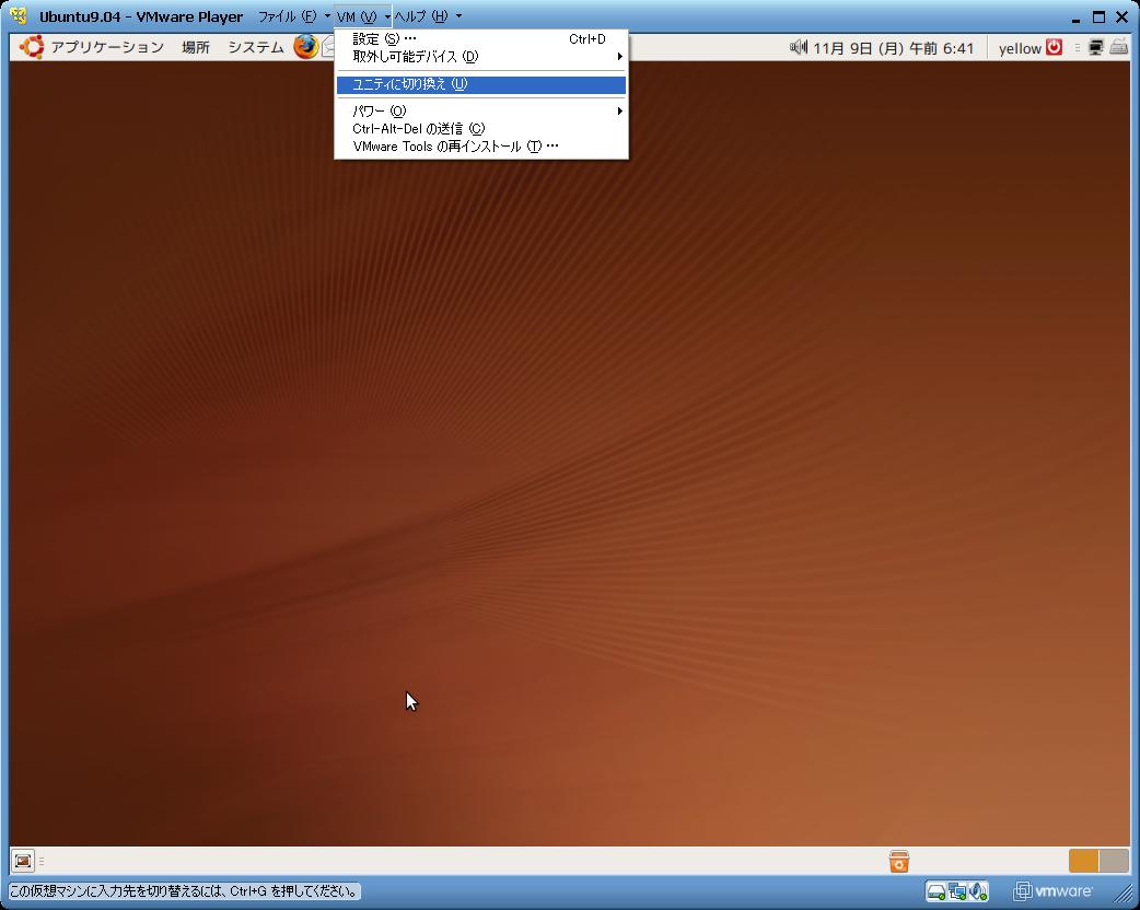 | これはVMWarePlayer3の画面です。 上のメニューから「ユニティに切り替え」 を選択するだけです。 2.5.xでもそんな感じのメニューがあります。 (2.5.1は英語のみだったりするので、全部 の画面を用意するのは困難です。適宜 探してみてください。) |