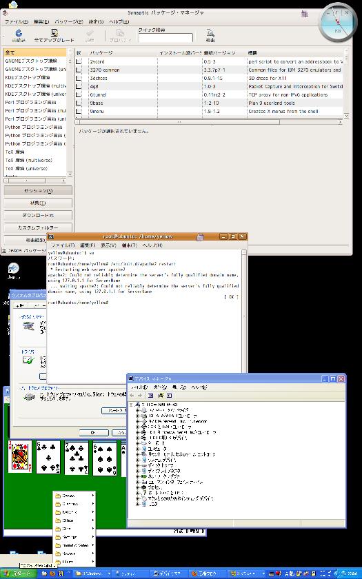 | UbuntuのSynapticパッケージマネージャと Windowsのデバイスマネージャが 同じデスクトップに混在しています。 Linux端末(コンソール)も表示されています。 つまりゲストOSのウインドゥをホストOSに表示 する機能が、ユニティです。 |